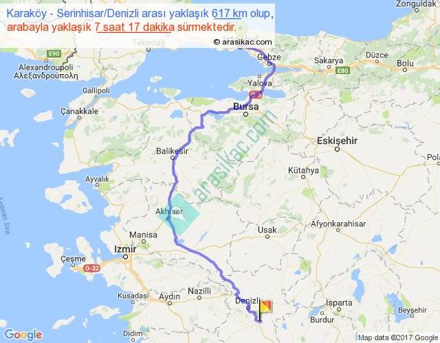 Karaköy - Serinhisar Denizli arası yaklaşık olarak 90 km/h ile yukarıda belirtilen sürede olup, iki yerin kuş uçuşu uzaklığı (mesafesi) 378'dir. Eğer belirtilen yerler arasında uçak seferi var ise bu süre uçakla 34 dakika'ya kadar düşebilir. Yolculuk otobüsle 9 saat 28 dakika sürmektedir.