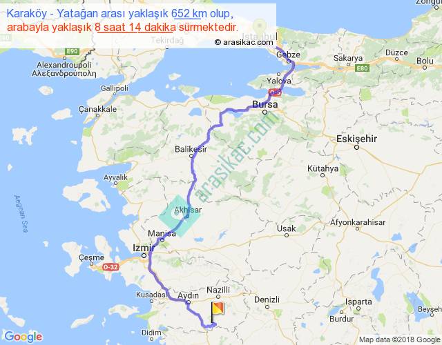Karaköy - Yatağan arası yaklaşık olarak 90 km/h ile yukarıda belirtilen sürede olup, iki yerin kuş uçuşu uzaklığı (mesafesi) 386'dir. Eğer belirtilen yerler arasında uçak seferi var ise bu süre uçakla 35 dakika'ya kadar düşebilir. Yolculuk otobüsle 10 saat 42 dakika sürmektedir.