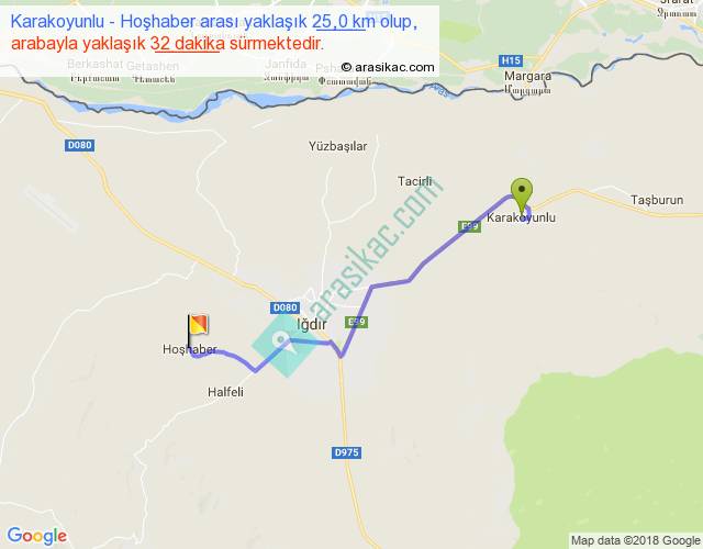 Karakoyunlu - Hoşhaber arası yaklaşık olarak 90 km/h ile yukarıda belirtilen sürede olup, iki yerin kuş uçuşu uzaklığı (mesafesi) 19'dir. Yolculuk otobüsle 41 dakika sürmektedir.