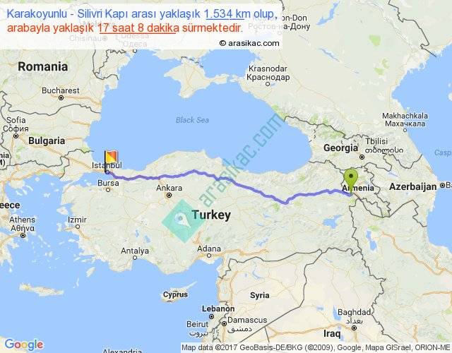 Karakoyunlu - Silivri Kapı arası yaklaşık olarak 90 km/h ile yukarıda belirtilen sürede olup, iki yerin kuş uçuşu uzaklığı (mesafesi) 1285'dir. Eğer belirtilen yerler arasında uçak seferi var ise bu süre uçakla 1 saat 58 dakika'ya kadar düşebilir. Yolculuk otobüsle 22 saat 16 dakika sürmektedir.