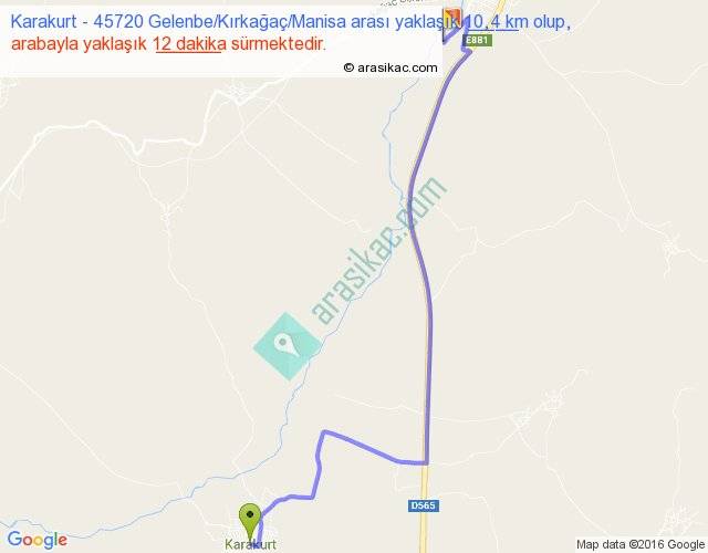 Karakurt - 45720 Gelenbe Kırkağaç Manisa arası yaklaşık olarak 90 km/h ile yukarıda belirtilen sürede olup, iki yerin kuş uçuşu uzaklığı (mesafesi) 7'dir. Yolculuk otobüsle 15 dakika sürmektedir.