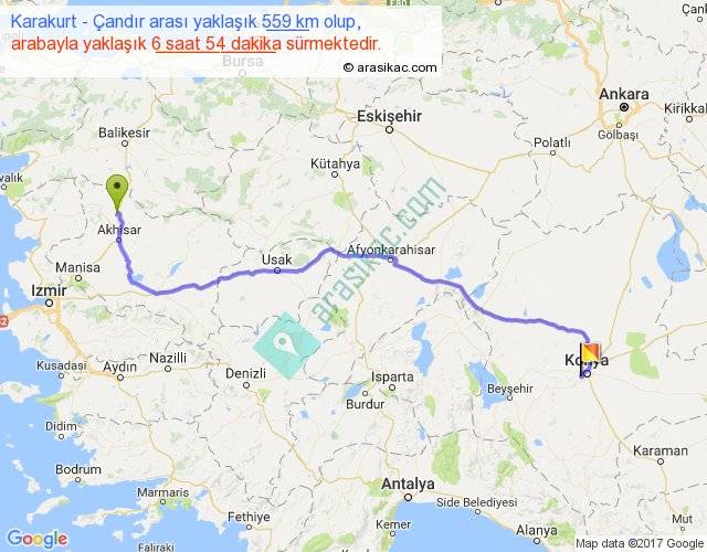 Karakurt - Çandır arası yaklaşık olarak 90 km/h ile yukarıda belirtilen sürede olup, iki yerin kuş uçuşu uzaklığı (mesafesi) 424'dir. Eğer belirtilen yerler arasında uçak seferi var ise bu süre uçakla 39 dakika'ya kadar düşebilir. Yolculuk otobüsle 8 saat 58 dakika sürmektedir.
