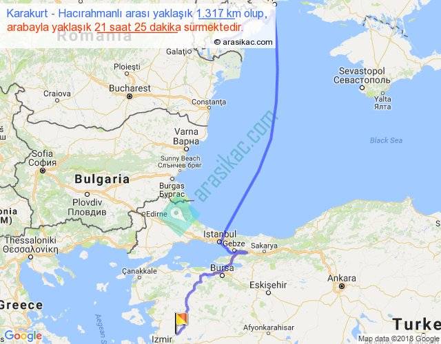 Karakurt - Hacırahmanlı arası yaklaşık olarak 90 km/h ile yukarıda belirtilen sürede olup, iki yerin kuş uçuşu uzaklığı (mesafesi) 767'dir. Eğer belirtilen yerler arasında uçak seferi var ise bu süre uçakla 1 saat 10 dakika'ya kadar düşebilir. Yolculuk otobüsle 1 gün 3 saat sürmektedir.