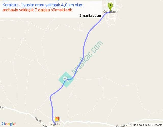Karakurt - İlyaslar arası yaklaşık olarak 90 km/h ile yukarıda belirtilen sürede olup, iki yerin kuş uçuşu uzaklığı (mesafesi) 4'dir. Yolculuk otobüsle 9 dakika sürmektedir.