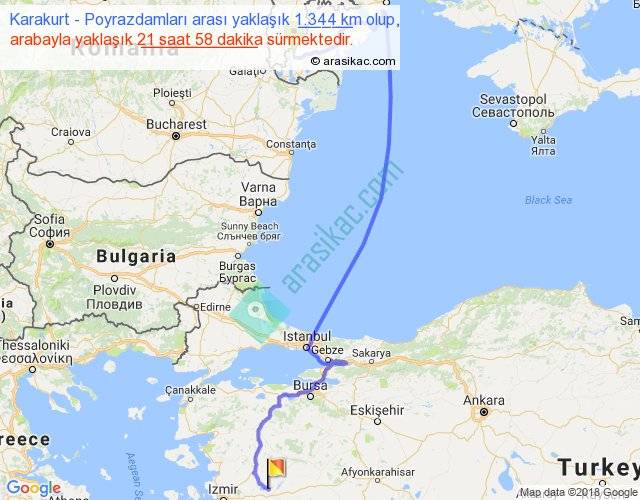 Karakurt - Poyrazdamları arası yaklaşık olarak 90 km/h ile yukarıda belirtilen sürede olup, iki yerin kuş uçuşu uzaklığı (mesafesi) 778'dir. Eğer belirtilen yerler arasında uçak seferi var ise bu süre uçakla 1 saat 11 dakika'ya kadar düşebilir. Yolculuk otobüsle 1 gün 4 saat sürmektedir.