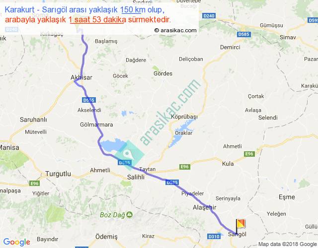 Karakurt - Sarıgöl arası yaklaşık olarak 90 km/h ile yukarıda belirtilen sürede olup, iki yerin kuş uçuşu uzaklığı (mesafesi) 123'dir. Yolculuk otobüsle 2 saat 26 dakika sürmektedir.