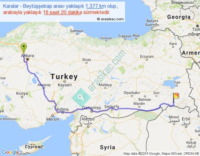 Karalar - Beytüşşebap arası yaklaşık olarak 90 km/h ile yukarıda belirtilen sürede olup, iki yerin kuş uçuşu uzaklığı (mesafesi) 953'dir. Eğer belirtilen yerler arasında uçak seferi var ise bu süre uçakla 1 saat 27 dakika'ya kadar düşebilir. Yolculuk otobüsle 21 saat 14 dakika sürmektedir.