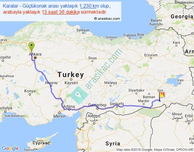 Karalar - Güçlükonak arası yaklaşık olarak 90 km/h ile yukarıda belirtilen sürede olup, iki yerin kuş uçuşu uzaklığı (mesafesi) 856'dir. Eğer belirtilen yerler arasında uçak seferi var ise bu süre uçakla 1 saat 19 dakika'ya kadar düşebilir. Yolculuk otobüsle 17 saat 40 dakika sürmektedir.