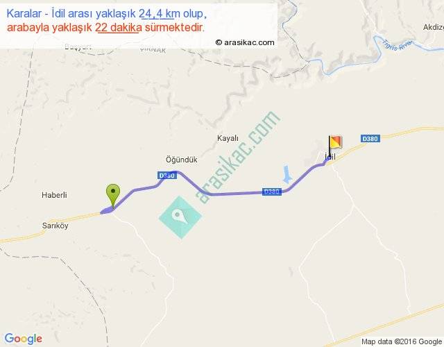 Karalar - İdil arası yaklaşık olarak 90 km/h ile yukarıda belirtilen sürede olup, iki yerin kuş uçuşu uzaklığı (mesafesi) 19'dir. Yolculuk otobüsle 28 dakika sürmektedir.