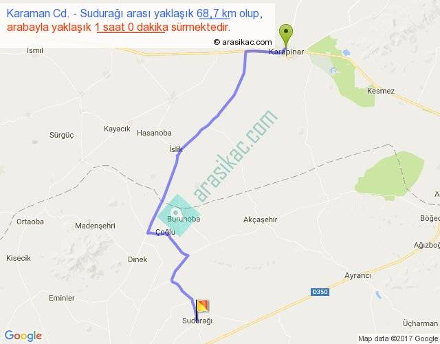 Karaman Cd. - Sudurağı arası yaklaşık olarak 90 km/h ile yukarıda belirtilen sürede olup, iki yerin kuş uçuşu uzaklığı (mesafesi) 50'dir. Yolculuk otobüsle 1 saat 18 dakika sürmektedir.
