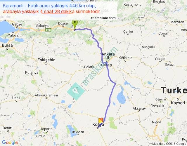 Karamanlı - Fatih arası yaklaşık olarak 90 km/h ile yukarıda belirtilen sürede olup, iki yerin kuş uçuşu uzaklığı (mesafesi) 322'dir. Eğer belirtilen yerler arasında uçak seferi var ise bu süre uçakla 29 dakika'ya kadar düşebilir. Yolculuk otobüsle 5 saat 48 dakika sürmektedir.