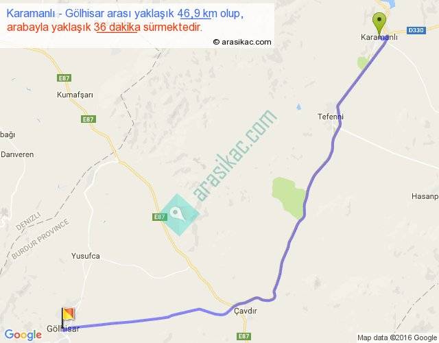 Karamanlı - Gölhisar arası yaklaşık olarak 90 km/h ile yukarıda belirtilen sürede olup, iki yerin kuş uçuşu uzaklığı (mesafesi) 38'dir. Yolculuk otobüsle 46 dakika sürmektedir.