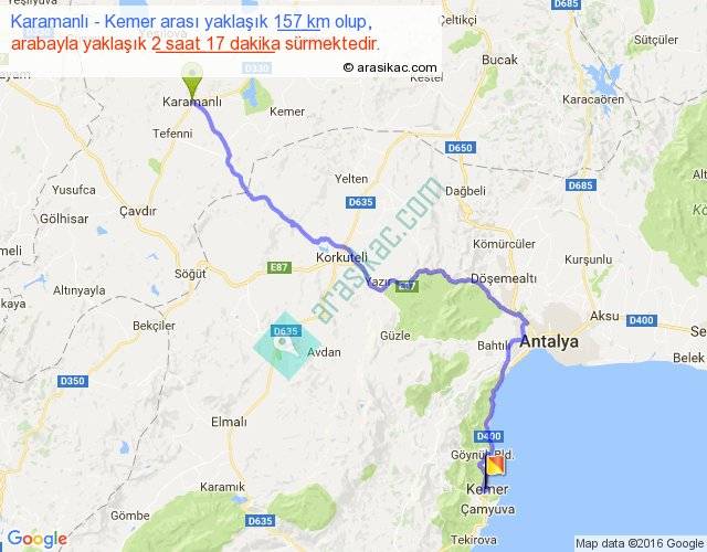 Karamanlı - Kemer arası yaklaşık olarak 90 km/h ile yukarıda belirtilen sürede olup, iki yerin kuş uçuşu uzaklığı (mesafesi) 107'dir. Yolculuk otobüsle 2 saat 58 dakika sürmektedir.