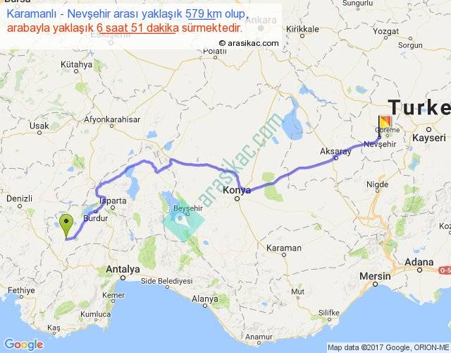 Karamanlı - Nevşehir arası yaklaşık olarak 90 km/h ile yukarıda belirtilen sürede olup, iki yerin kuş uçuşu uzaklığı (mesafesi) 448'dir. Eğer belirtilen yerler arasında uçak seferi var ise bu süre uçakla 41 dakika'ya kadar düşebilir. Yolculuk otobüsle 8 saat 54 dakika sürmektedir.