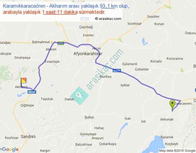 Karamıkkaracaören - Akharım arası yaklaşık olarak 90 km/h ile yukarıda belirtilen sürede olup, iki yerin kuş uçuşu uzaklığı (mesafesi) 59'dir. Yolculuk otobüsle 1 saat 32 dakika sürmektedir.