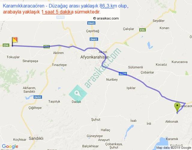 Karamıkkaracaören - Düzağaç arası yaklaşık olarak 90 km/h ile yukarıda belirtilen sürede olup, iki yerin kuş uçuşu uzaklığı (mesafesi) 70'dir. Yolculuk otobüsle 1 saat 24 dakika sürmektedir.