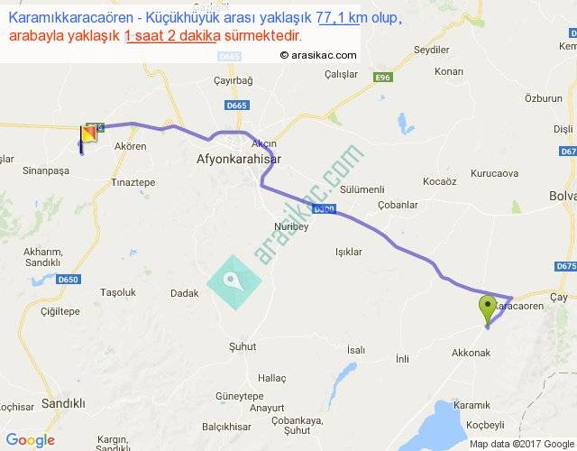 Karamıkkaracaören - Küçükhüyük arası yaklaşık olarak 90 km/h ile yukarıda belirtilen sürede olup, iki yerin kuş uçuşu uzaklığı (mesafesi) 58'dir. Yolculuk otobüsle 1 saat 20 dakika sürmektedir.