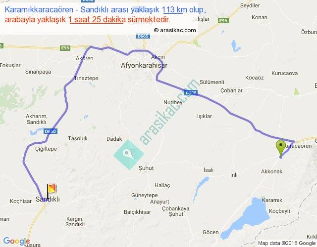 Karamıkkaracaören - Sandıklı arası yaklaşık olarak 90 km/h ile yukarıda belirtilen sürede olup, iki yerin kuş uçuşu uzaklığı (mesafesi) 57'dir. Yolculuk otobüsle 1 saat 50 dakika sürmektedir.