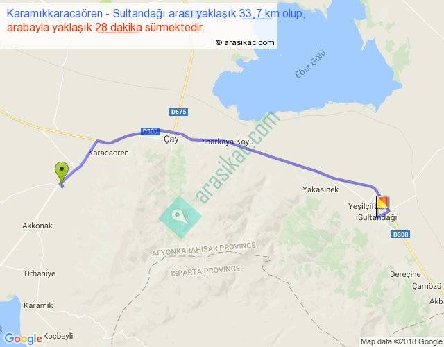 Karamıkkaracaören - Sultandağı arası yaklaşık olarak 90 km/h ile yukarıda belirtilen sürede olup, iki yerin kuş uçuşu uzaklığı (mesafesi) 27'dir. Yolculuk otobüsle 36 dakika sürmektedir.