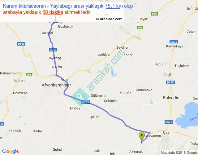 Karamıkkaracaören - Yaylabağı arası yaklaşık olarak 90 km/h ile yukarıda belirtilen sürede olup, iki yerin kuş uçuşu uzaklığı (mesafesi) 57'dir. Yolculuk otobüsle 1 saat 15 dakika sürmektedir.