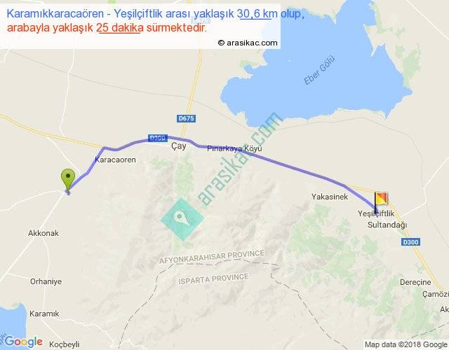 Karamıkkaracaören - Yeşilçiftlik arası yaklaşık olarak 90 km/h ile yukarıda belirtilen sürede olup, iki yerin kuş uçuşu uzaklığı (mesafesi) 26'dir. Yolculuk otobüsle 32 dakika sürmektedir.