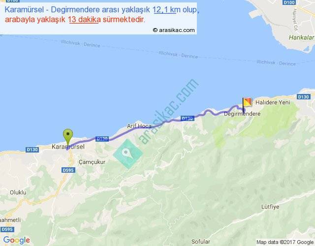 Karamürsel - Degirmendere arası yaklaşık olarak 90 km/h ile yukarıda belirtilen sürede olup, iki yerin kuş uçuşu uzaklığı (mesafesi) 10'dir. Yolculuk otobüsle 16 dakika sürmektedir.