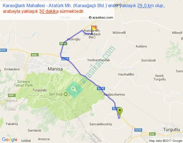 Karaoğlanlı Mahallesi - Atatürk Mh. (Karaağaçlı Bld.) arası yaklaşık olarak 90 km/h ile yukarıda belirtilen sürede olup, iki yerin kuş uçuşu uzaklığı (mesafesi) 18'dir. Yolculuk otobüsle 39 dakika sürmektedir.