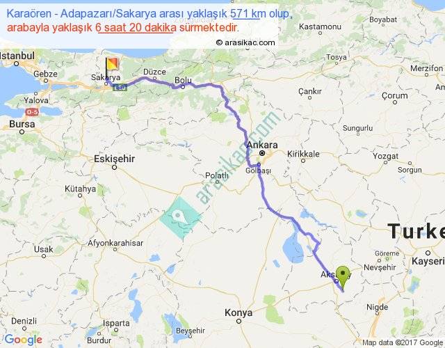 Karaören - Adapazarı Sakarya arası yaklaşık olarak 90 km/h ile yukarıda belirtilen sürede olup, iki yerin kuş uçuşu uzaklığı (mesafesi) 427'dir. Eğer belirtilen yerler arasında uçak seferi var ise bu süre uçakla 39 dakika'ya kadar düşebilir. Yolculuk otobüsle 8 saat 14 dakika sürmektedir.