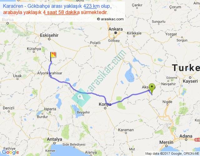 Karaören - Gökbahçe arası yaklaşık olarak 90 km/h ile yukarıda belirtilen sürede olup, iki yerin kuş uçuşu uzaklığı (mesafesi) 322'dir. Eğer belirtilen yerler arasında uçak seferi var ise bu süre uçakla 29 dakika'ya kadar düşebilir. Yolculuk otobüsle 6 saat 27 dakika sürmektedir.