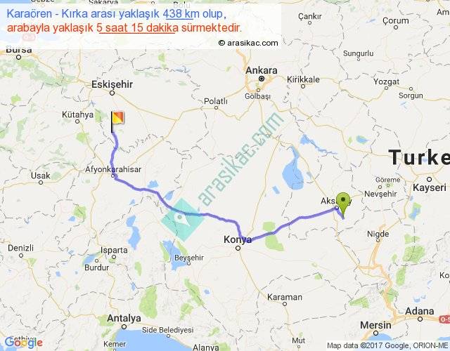 Karaören - Kırka arası yaklaşık olarak 90 km/h ile yukarıda belirtilen sürede olup, iki yerin kuş uçuşu uzaklığı (mesafesi) 331'dir. Eğer belirtilen yerler arasında uçak seferi var ise bu süre uçakla 30 dakika'ya kadar düşebilir. Yolculuk otobüsle 6 saat 49 dakika sürmektedir.
