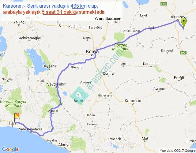 Karaören - Serik arası yaklaşık olarak 90 km/h ile yukarıda belirtilen sürede olup, iki yerin kuş uçuşu uzaklığı (mesafesi) 303'dir. Eğer belirtilen yerler arasında uçak seferi var ise bu süre uçakla 27 dakika'ya kadar düşebilir. Yolculuk otobüsle 7 saat 10 dakika sürmektedir.