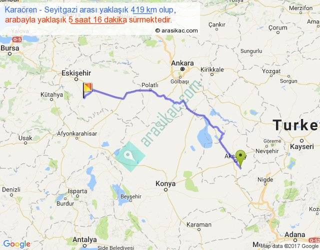 Karaören - Seyitgazi arası yaklaşık olarak 90 km/h ile yukarıda belirtilen sürede olup, iki yerin kuş uçuşu uzaklığı (mesafesi) 324'dir. Eğer belirtilen yerler arasında uçak seferi var ise bu süre uçakla 29 dakika'ya kadar düşebilir. Yolculuk otobüsle 6 saat 50 dakika sürmektedir.