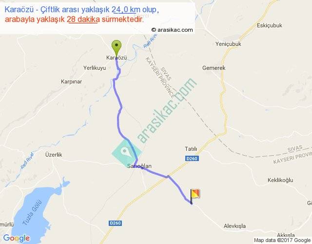 Karaözü - Çiftlik arası yaklaşık olarak 90 km/h ile yukarıda belirtilen sürede olup, iki yerin kuş uçuşu uzaklığı (mesafesi) 20'dir. Yolculuk otobüsle 36 dakika sürmektedir.