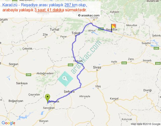 Karaözü - Reşadiye arası yaklaşık olarak 90 km/h ile yukarıda belirtilen sürede olup, iki yerin kuş uçuşu uzaklığı (mesafesi) 178'dir. Yolculuk otobüsle 4 saat 47 dakika sürmektedir.