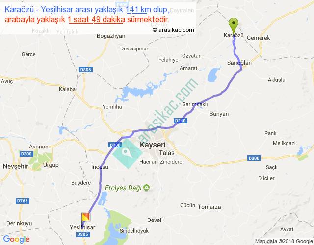 Karaözü - Yeşilhisar arası yaklaşık olarak 90 km/h ile yukarıda belirtilen sürede olup, iki yerin kuş uçuşu uzaklığı (mesafesi) 118'dir. Yolculuk otobüsle 2 saat 21 dakika sürmektedir.