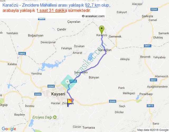 Karaözü - Zincidere Mahallesi arası yaklaşık olarak 90 km/h ile yukarıda belirtilen sürede olup, iki yerin kuş uçuşu uzaklığı (mesafesi) 71'dir. Yolculuk otobüsle 1 saat 58 dakika sürmektedir.