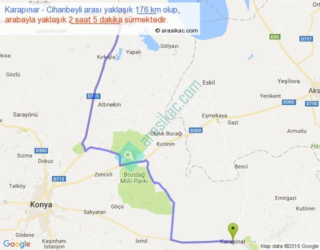 Eğer Karapınar Cihanbeyli arası ne kadar yakar (benzin/mazot) diyorsanız, kilometrede 3 ₺ yakan bir aracınız var ise 528, km'de 4 ₺ yakan bir aracınız var ise 704, km'de 5 ₺ yakan bir aracınız var ise 880 ile bu yolculuğu tamamlayabilirsiniz.