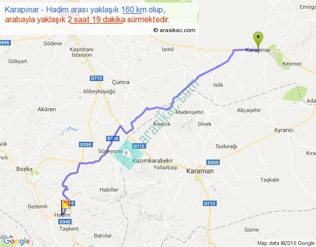 Karapınar - Hadim arası yaklaşık olarak 90 km/h ile yukarıda belirtilen sürede olup, iki yerin kuş uçuşu uzaklığı (mesafesi) 125'dir. Yolculuk otobüsle 3 saat 0 dakika sürmektedir.