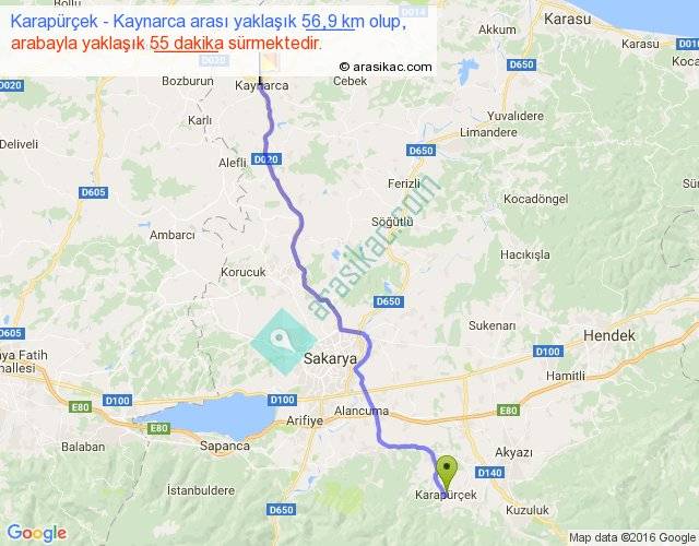 Karapürçek - Kaynarca arası yaklaşık olarak 90 km/h ile yukarıda belirtilen sürede olup, iki yerin kuş uçuşu uzaklığı (mesafesi) 47'dir. Yolculuk otobüsle 1 saat 11 dakika sürmektedir.