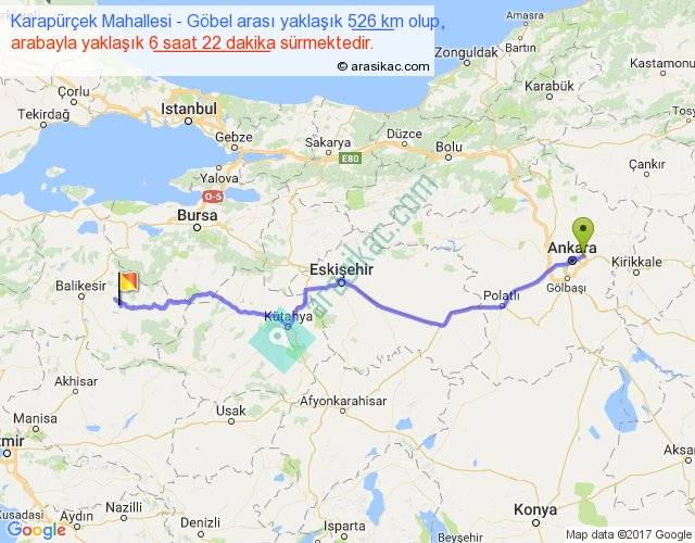Karapürçek Mahallesi - Göbel arası yaklaşık olarak 90 km/h ile yukarıda belirtilen sürede olup, iki yerin kuş uçuşu uzaklığı (mesafesi) 400'dir. Eğer belirtilen yerler arasında uçak seferi var ise bu süre uçakla 36 dakika'ya kadar düşebilir. Yolculuk otobüsle 8 saat 16 dakika sürmektedir.