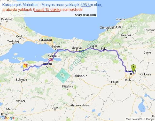 Karapürçek Mahallesi - Manyas arası yaklaşık olarak 90 km/h ile yukarıda belirtilen sürede olup, iki yerin kuş uçuşu uzaklığı (mesafesi) 424'dir. Eğer belirtilen yerler arasında uçak seferi var ise bu süre uçakla 39 dakika'ya kadar düşebilir. Yolculuk otobüsle 8 saat 7 dakika sürmektedir.