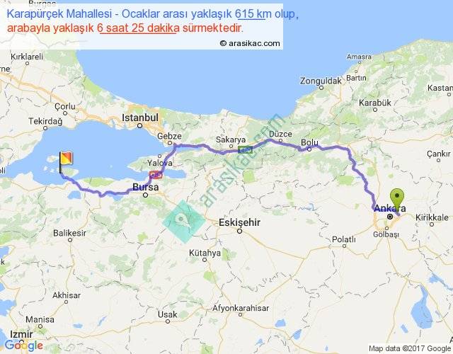 Karapürçek Mahallesi - Ocaklar arası yaklaşık olarak 90 km/h ile yukarıda belirtilen sürede olup, iki yerin kuş uçuşu uzaklığı (mesafesi) 443'dir. Eğer belirtilen yerler arasında uçak seferi var ise bu süre uçakla 40 dakika'ya kadar düşebilir. Yolculuk otobüsle 8 saat 20 dakika sürmektedir.