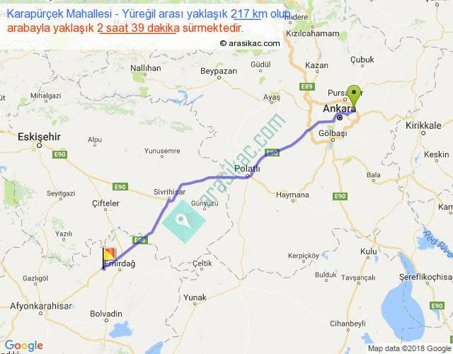 Karapürçek Mahallesi - Yüreğil arası yaklaşık olarak 90 km/h ile yukarıda belirtilen sürede olup, iki yerin kuş uçuşu uzaklığı (mesafesi) 196'dir. Yolculuk otobüsle 3 saat 26 dakika sürmektedir.