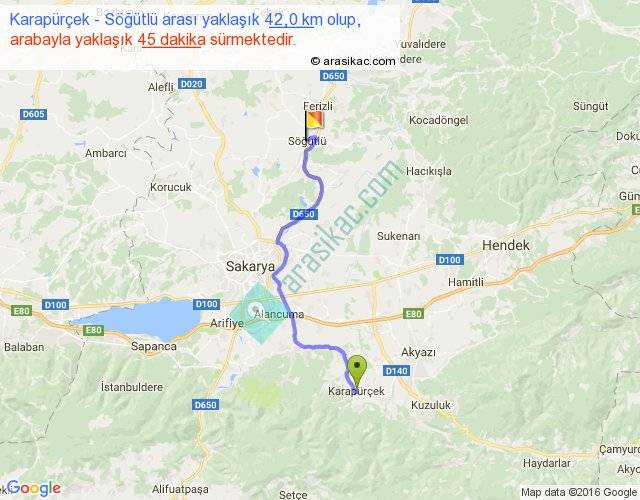 Karapürçek - Söğütlü arası yaklaşık olarak 90 km/h ile yukarıda belirtilen sürede olup, iki yerin kuş uçuşu uzaklığı (mesafesi) 29'dir. Yolculuk otobüsle 58 dakika sürmektedir.