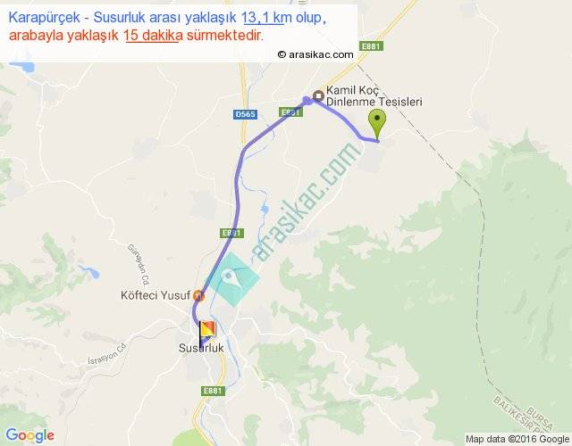 Karapürçek - Susurluk arası yaklaşık olarak 90 km/h ile yukarıda belirtilen sürede olup, iki yerin kuş uçuşu uzaklığı (mesafesi) 9'dir. Yolculuk otobüsle 19 dakika sürmektedir.