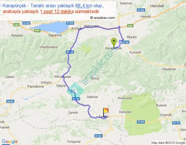 Karapürçek - Taraklı arası yaklaşık olarak 90 km/h ile yukarıda belirtilen sürede olup, iki yerin kuş uçuşu uzaklığı (mesafesi) 28'dir. Yolculuk otobüsle 1 saat 33 dakika sürmektedir.