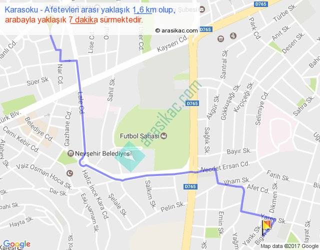 Karasoku - Afetevleri arası yaklaşık olarak 90 km/h ile yukarıda belirtilen sürede olup, iki yerin kuş uçuşu uzaklığı (mesafesi) 1'dir. Yolculuk otobüsle 9 dakika sürmektedir.
