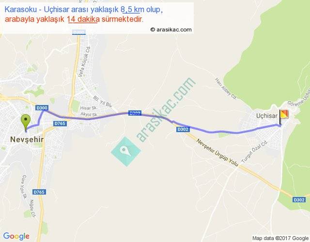 Karasoku - Uçhisar arası yaklaşık olarak 90 km/h ile yukarıda belirtilen sürede olup, iki yerin kuş uçuşu uzaklığı (mesafesi) 8'dir. Yolculuk otobüsle 18 dakika sürmektedir.