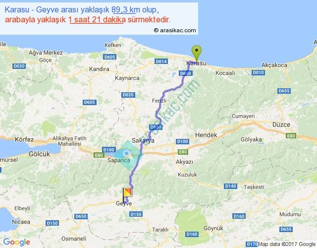 Karasu - Geyve arası yaklaşık olarak 90 km/h ile yukarıda belirtilen sürede olup, iki yerin kuş uçuşu uzaklığı (mesafesi) 73'dir. Yolculuk otobüsle 1 saat 41 dakika sürmektedir.