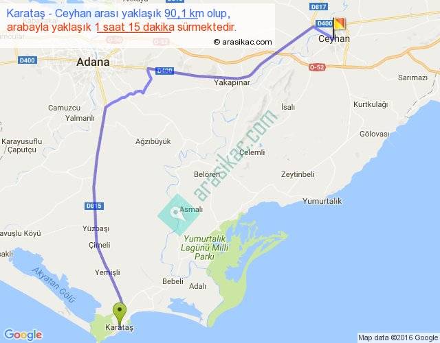 Karataş - Ceyhan arası yaklaşık olarak 90 km/h ile yukarıda belirtilen sürede olup, iki yerin kuş uçuşu uzaklığı (mesafesi) 64'dir. Yolculuk otobüsle 1 saat 37 dakika sürmektedir.